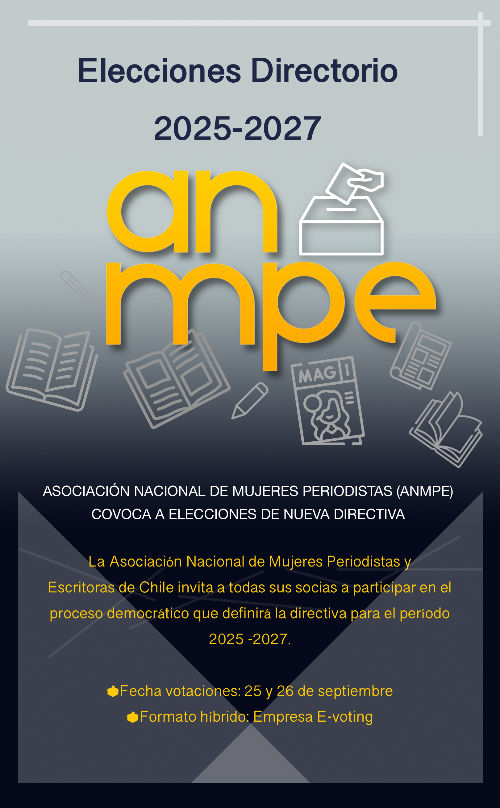 1° Estudio de Mujeres Periodistas Manual de género para periodistas y medios de comunicación Segundo Estudio de MujeresPeriodistas de Chile Segundo Estudio de MujeresPeriodistas de Chile Noticias Comunicados de Prensa | Noticias ANMPE renueva su directorio para el período 2025–2027 septiembre 26, 2025octubre 3, 2025 Comunicados de Prensa | Noticias ANMPE expone en el Senado por proyecto “Ley Mordaza 2.0” agosto 25, 2025octubre 3, 2025 Comunicados de Prensa | Noticias Quieres ser candidata al directorio de ANMPE agosto 20, 2025septiembre 7, 2025 Comunicados de Prensa | Noticias Elecciones Directorio 2025-2027 agosto 18, 2025septiembre 7, 2025 Comunicados de Prensa | Noticias ANMPE y Universidad Central inauguran la Cátedra Lenka Franulic junio 25, 2025octubre 3, 2025 Comunicados de Prensa | Noticias Encuentro de mujeres periodistas: reflexiones sobre el rol de la prensa en la Agenda 2030 abril 24, 2025octubre 3, 2025